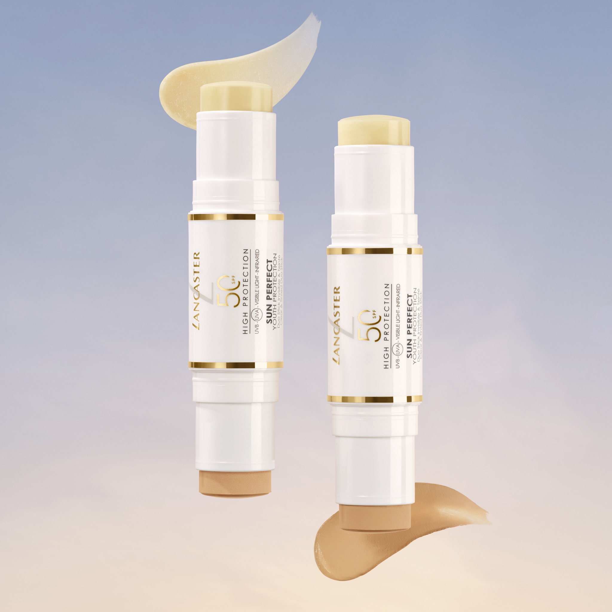 Sun Perfect Clear & Tinted Duo Stick SPF 50 της LANCASTER: Με διαφανή και χρωματιστή πλευρά, παρέχει στοχευμένη προστασία και τέλεια εφαρμογή ακόμη και πάνω από το μακιγιάζ, ενώ επανακυκλοφορεί χωρίς άρωμα για χρήση και στα χείλη.