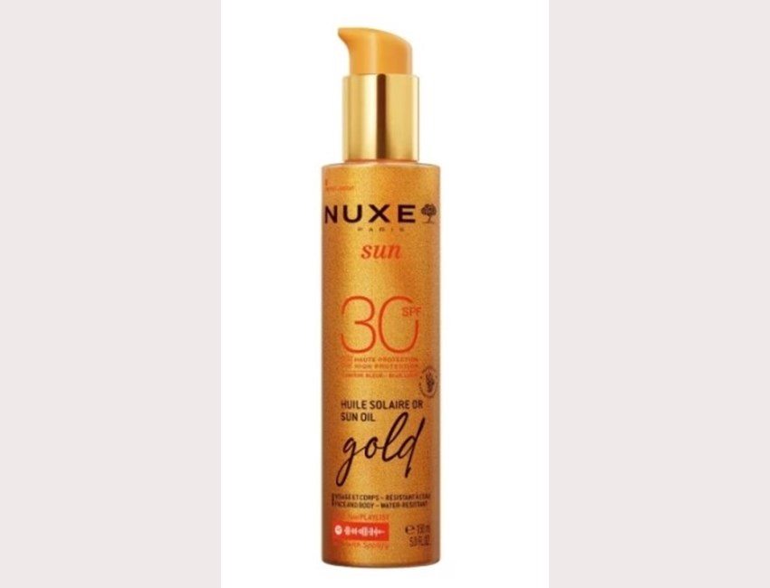 Ιριδίζον αντηλιακό λάδι για πρόσωπο & σώμα, Sun Oil Gold Spf30, Nuxe : Με υψηλό δείκτη προστασίας SPF30, που προστατεύει από την ακτινοβολία UVA και UVB και το μπλε φως, ενώ χαρίζει στο δέρμα μια διακριτική χρυσαφένια λάμψη.