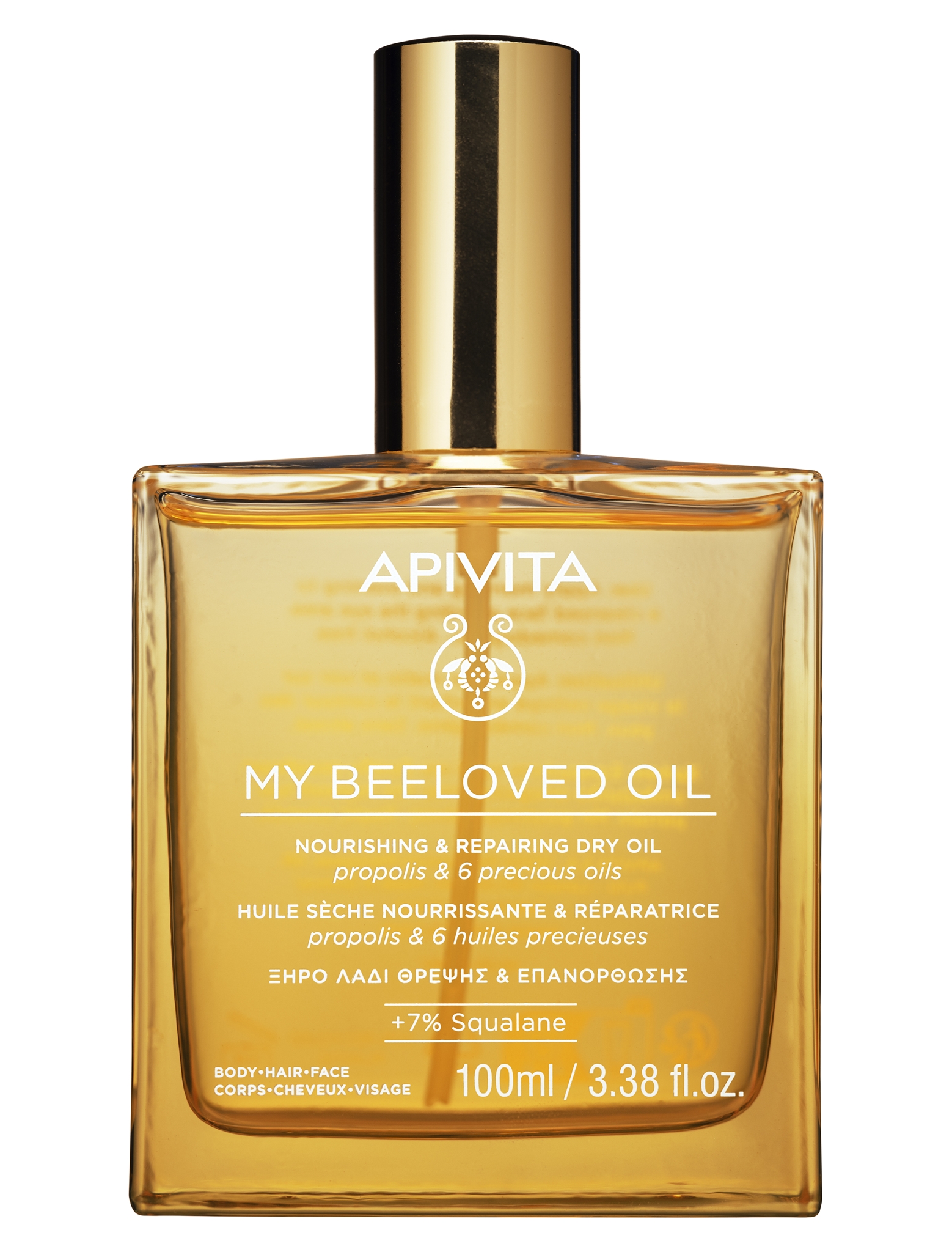 Φυσικό άγγιγμα: Πολυχρηστικό ξηρό λάδι λάμψης με πρόπολη, 6 πολύτιμα έλαια και σκουαλάνιο, My Beeloved Oil της APIVITA (στα φαρμακεία).
