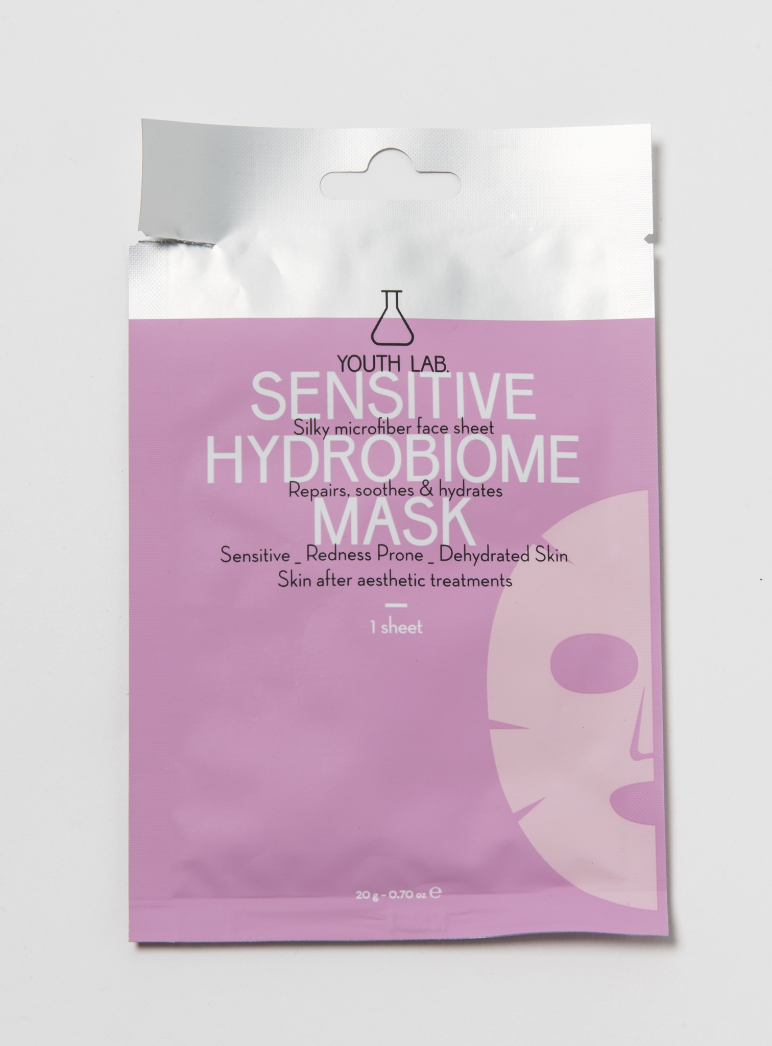 Sensitive Hydro Biome Sheet Mask της YOUTH LAB: Βιοδιασπώμενη μάσκα με 200ml ορού που ηρεμεί το δέρμα με ευαισθησία ή έπειτα από laser, δερμοαπόξεση κ.ά. (στα φαρμακεία).